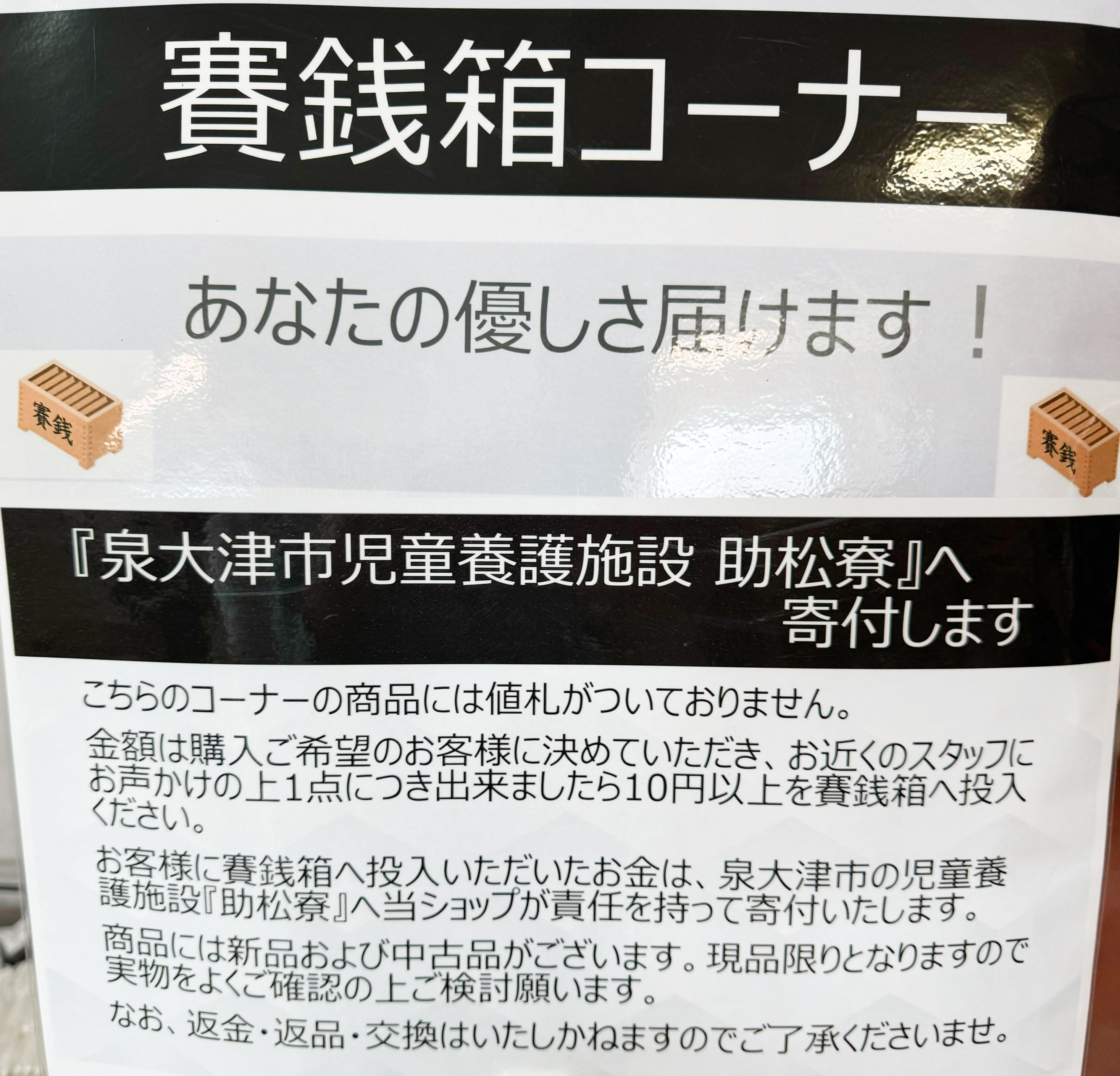 数百円程度の商品は、あえて値段をつけずにご自由にお持ち帰りいただき、お気持ちとして賽銭箱に入れていただいた金額を児童養護施設へ寄付するという取り組みを行っています。
